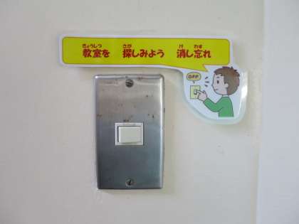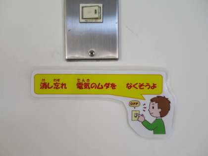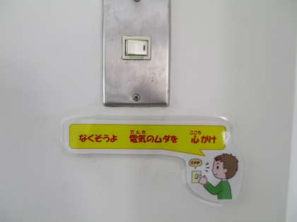 電気の消し忘れを防ぎ、資源の無駄使いをなくせるように、学校中の電気のスイッチの部分にいろいろな標語を掲示しています。意識したいですね。