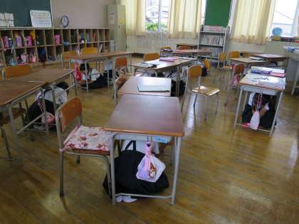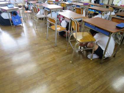 午前11時に880万人訓練を実施しました。地震・津波を想定しているため、机の下に避難した後は、全学年が4階の教室に分かれて避難しました。