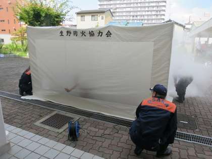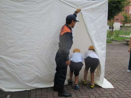 高学年は、「地震がきた時にできること」を学習したり、防災クイズをしたりしました。煙テント体験も行いました。