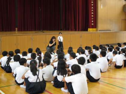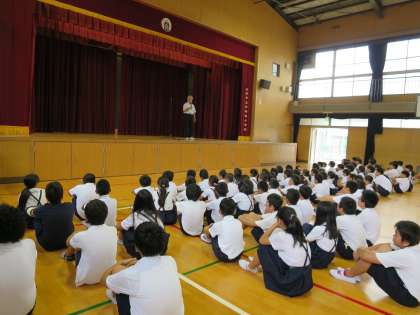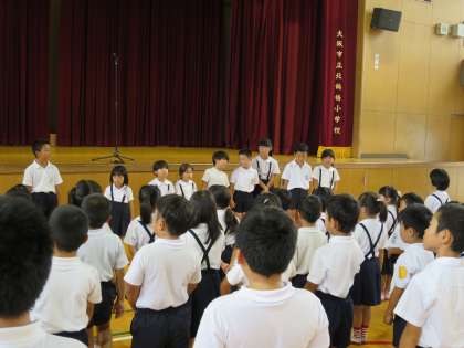 今朝の児童朝会では、校長先生から来週の2つの祝日についてのお話がありました。朝会の前には、いいところ見付けの発表もありました。また、今日から新しく加わるポーランド語での「おはようございます」「さようなら」のあいさつを児童に教えてもらいました。