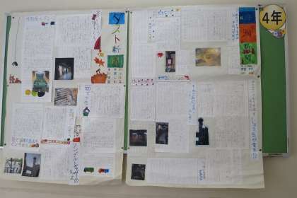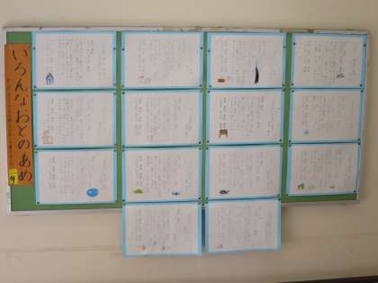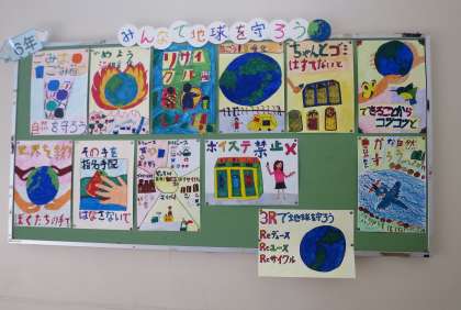 階段の踊り場の掲示です。2年生は、「いろんなおとのあめ」の詩を、4年生はごみ工場見学の壁新聞を、6年生は「みんなで地球を守ろう」のポスターを掲示しています。じっくり見ていると、一人一人の工夫が感じられて楽しいです。