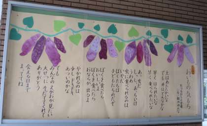 10月に入り、秋を感じることも多くなってきました。今月の玄関掲示は2年生が作った作品が掲示されています。「おいもの気もち」の詩とともに、見事なさつまいもがたくさん!ご来校の際には、ぜひご覧ください。