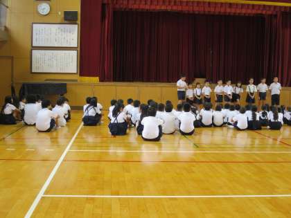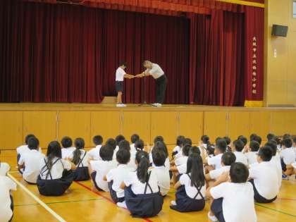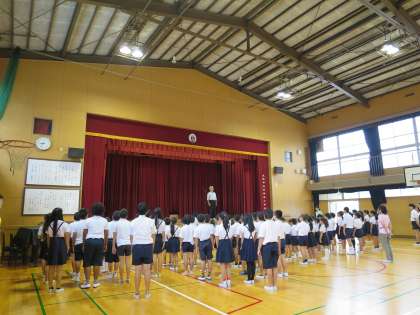 今朝の児童朝会では、校長先生から「10月10日」についてのお話がありました。何の日か、2つ教えていただきましたね。覚えていますか?また、あいさつ隊の児童によるいいところ見つけの発表や版画作品の表彰もありました。