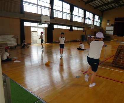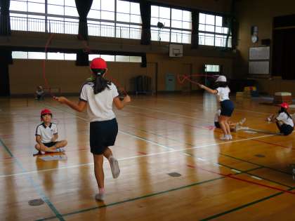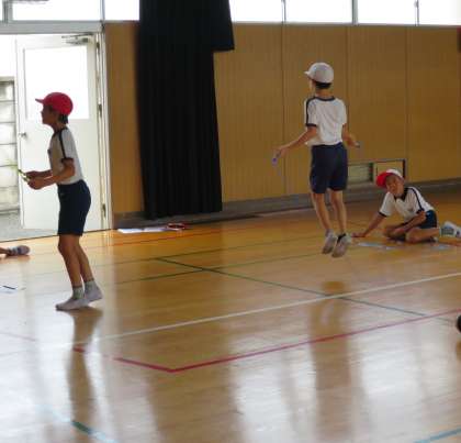 4年生の体育の時間です。授業の始めに、なわとびカードを基にお互いの記録をカウントしあっていました。記録を達成するたびに、カードに色をぬります!!