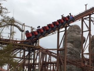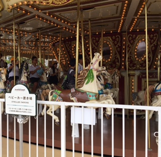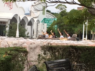 スペイン村でみんなで乗り物にのって楽しんでます。今のところ雨は大丈夫です。
