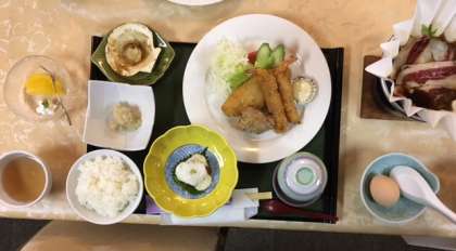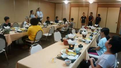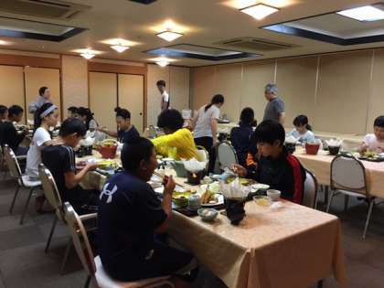 宿舎「ホテル浜離宮」で夕食を食べました。みんなおかわりをたくさんしました。
