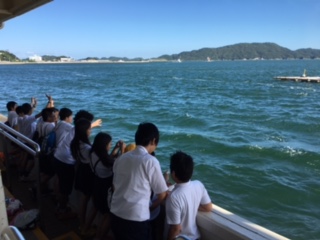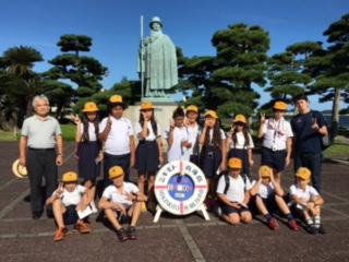 万華鏡作りの後は、海女さんの実演を見ました。真珠島の御木本幸吉銅像の前で記念写真を撮りました。ハイポーズ!