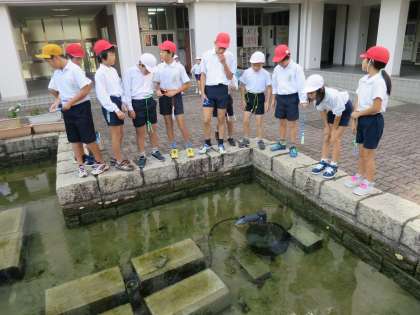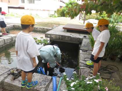 管理作業員さんが、池のそうじをしてくださっています。池の底がよく見えるくらいとてもきれいになりました。コイや、モツゴなどの様子がよく見えます。ありがとうございました。