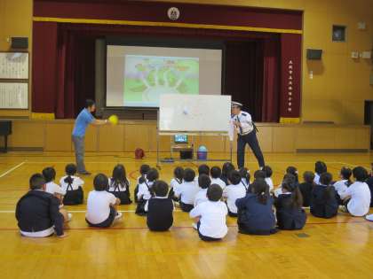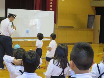 生野警察暑のおまわりさんに来ていただき、交通安全指導をしていただきました。生野区でよく起こる交通事故を例に挙げて、どうすれば防げるのか図を見ながらをみんなで考えました。また、スピードが速いほど、見えにくいという体験をボールを使って行いました。
