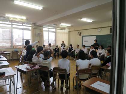 鶴橋中学校の授業を体験させていただきました。国語と英語と数学です。自分が選んだ教科の授業を、中学生と一緒に受けました。