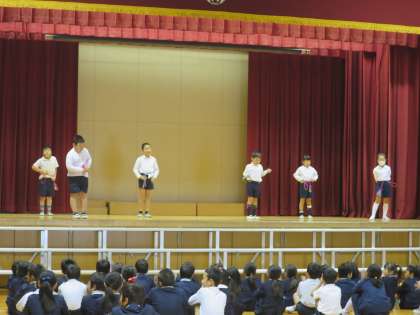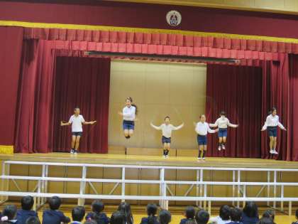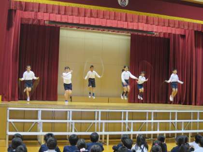 今朝の児童朝会では、各学級から選ばれたなわとび名人の児童が、舞台で技を披露しました。がんばって練習した成果をみんなに見てもらえて嬉しそうでした(*^_^*)