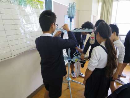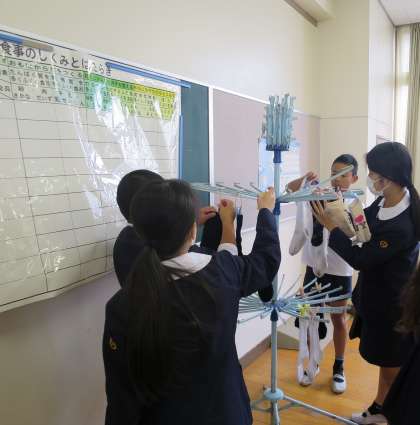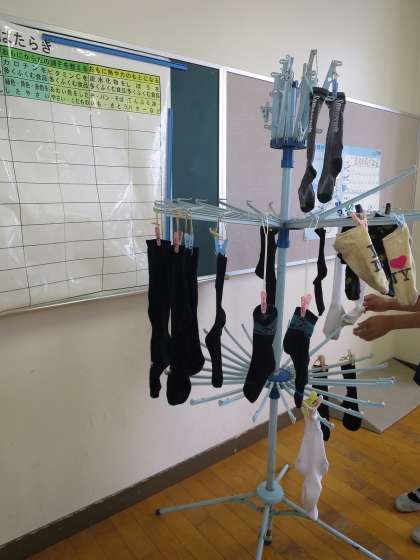 靴下をしっかりとすすいだ後は、固く絞って干しました。一つは、絞った後に伸ばさないもの、もう一つは、ピンと伸ばしたもの!さて明日の朝取り入れる時、どんな違いがでているかな?
