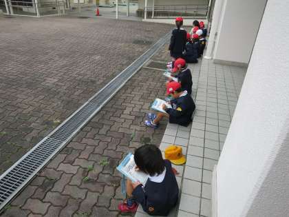 中庭や運動場で、落ち葉や木の実を拾って観察しました。赤や黄色、緑の葉っぱ、形も大きさも色々です。たくさん拾って、「こんなのあったよ!!」と嬉しそうに見せ合っていました(*^_^*)