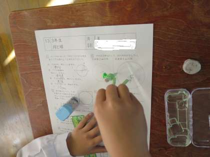 円と球」の単元の算数のテストをしていました。コンパスやものさしも使って、一生懸命問題を解いていました。