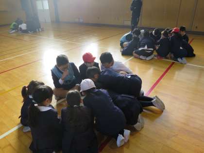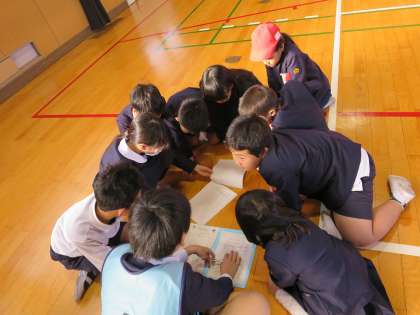 来年1月に行われる「北鶴フェスティバル」で、何のお店をするのか班で話し合いました。ぎゅっと小さく固まって、楽しそうに相談していました!