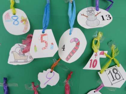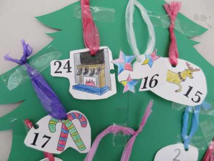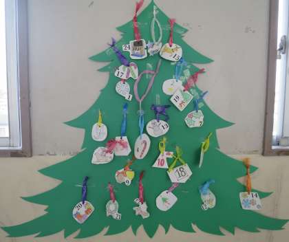 6年生が英語の時間に作った作品です。色々なクリスマス飾りの言い方を英語で学習し、日めくりカレンダー風のクリスマスツリーに仕上げました。