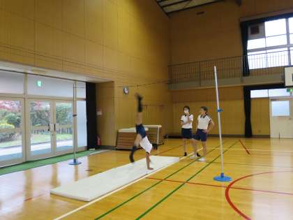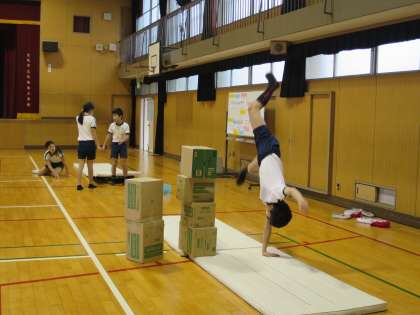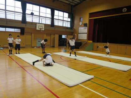 マット運動です。今度いろいろな技を組み合わせて発表をするので、練習をしていました。グループでアドバイスし合ったり、段ボールやふみきり板、ゴムや鈴などを使って技の完成度をみがきました!