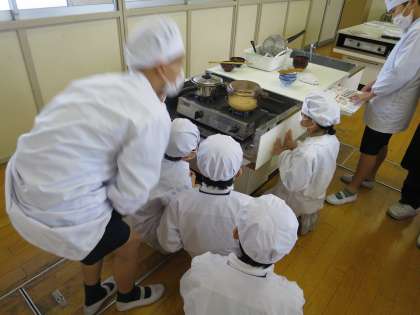 ゲストティーチャーの先生にとっていただいた、昆布とかつおの美味しいだしを使って、みそ汁をつくりました。お鍋でご飯も炊きました。グループで分担して調理し、おいしくできあがりました(*^_^*)