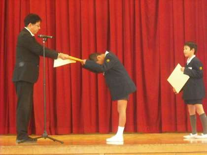 おおさか学校給食献立コンテストで、5年生児童が「アジアな給食、楽しいで賞」をいただいたので、校長先生から表彰していただきました。約2千名の応募の中から選ばれたそうです。