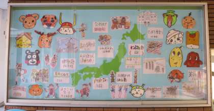 玄関の掲示板には、5年生の作品が掲示されています。日本各地のお祭りをご当地キャラクターも交えて紹介しています。いろいろなお祭りがあるんですね!ぜひご覧ください。