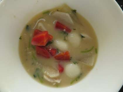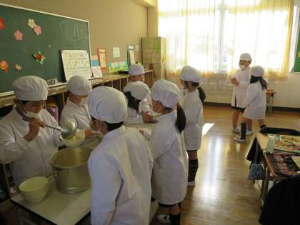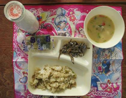 3学期の給食が始まりました。今日は、正月の行事献立・・・きんぴらちらし・ぞう煮・ごまめ・牛乳でした。今日のぞう煮の金時にんじんは、大阪の東住吉区で収獲されたものが使われているそうです。ごちそうさまでした。