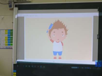 火曜日の朝は、イングリッシュタイムです。主人公の動作を真似しながらお話を見たり、アルファベット、フォニックスなどを楽しく学習しました。
