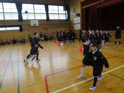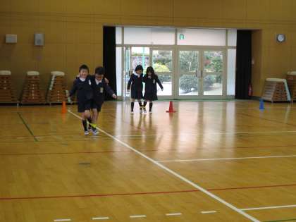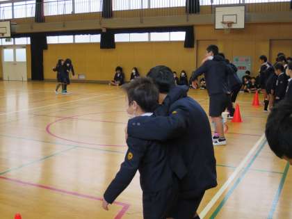 今朝の児童集会は、二人三脚でした。2人1組になって息を合わして走ります!肩を組んだり、手をつないだり・・・見ている児童からも拍手や応援が聞こえてきました。
