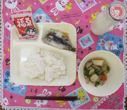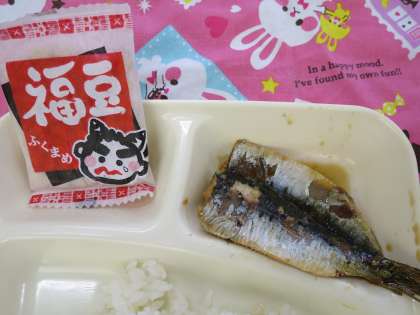 今日は節分です。給食の献立も、節分の行事献立でした。いわしのしょうがじょうゆかけやいり大豆など、節分の雰囲気を感じながらいただきました。ごちそうさまでした。