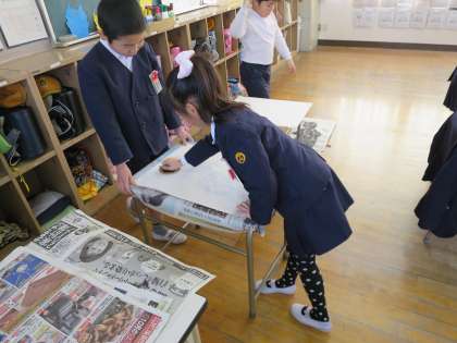 みんなの紙版画が完成しました。元気いっぱいの版画作品です。友達とペアになってバレンでこすって、はがして作品の仕上がりを見た時の嬉しそうな顔!ぜひ参観でご覧ください。