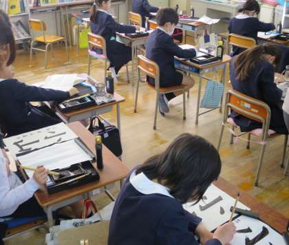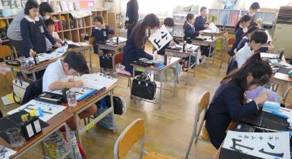 毛筆で「小山」と書く練習をしていて、今日は清書です。清書を何枚か仕上げて、先生にどちらがいいかを助言してもらって掲示の準備をしていました。