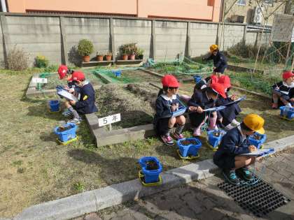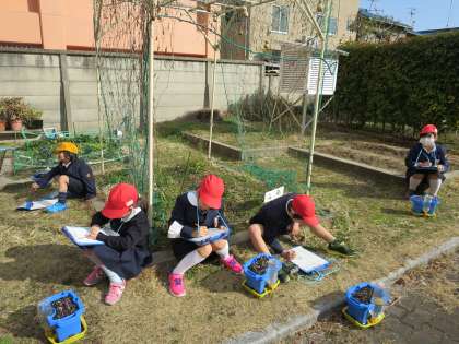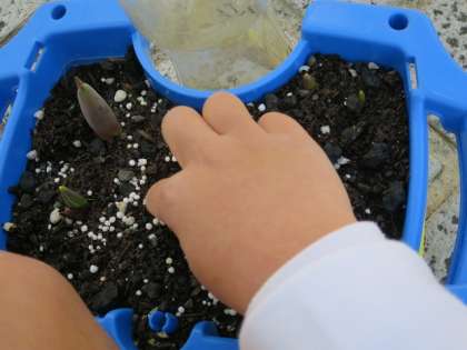 チューリップの球根から小さな芽が出てきました。芽がいくつ出ているのかうれしそうに数えていました(*^_^*)それから芽の形や色をよく見て絵を描きました。花が咲くのが楽しみです。