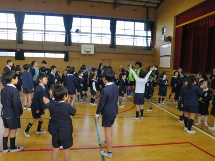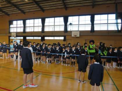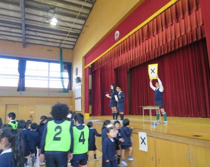 児童集会で、北鶴○×クイズを行いました。学校の中庭のコイの数、男女ではどちらが多いか・・・などです。正解が発表されるたびに「やった〜!!」と歓声があがっていました。