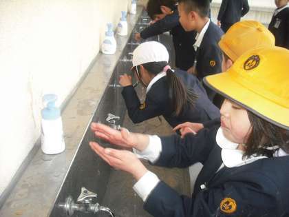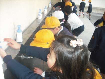 20分休み終了後の手洗い場の様子です。せっけんでしっかり手を洗い、うがいをしています。