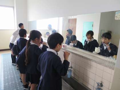 給食後歯みがきをし、その後に染めだしをしました。しっかりみがけているようでも、染めだしをするとみがけていない部分がすぐにわかりました。鏡を見ながら、丁寧に丁寧にもう一度歯みがきをしました!