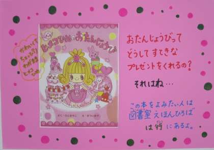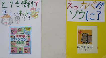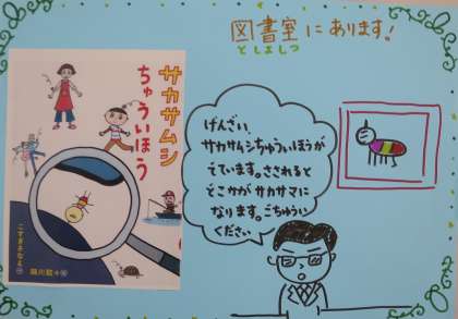 おすすめの本の紹介ポップが、学校のいろいろな場所に掲示されています。読んでみたいな!図書室のどの場所にあるのかも教えてくれていますよ。探して読んでみてね。