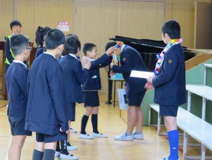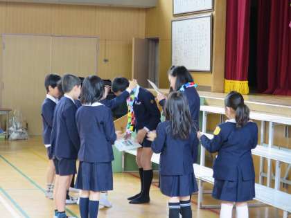 お世話になった6年生に、たてわり班で作った色紙とレイを一人一人にプレゼントしました。みんな嬉しそうな表情でした(*^_^*)
