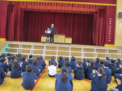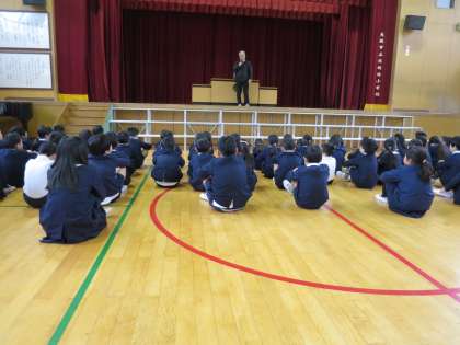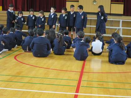 全校がそろう児童朝会は、今日で最後です。絵画コンクールの表彰の後、校長先生から震災のお話がありました。また「校長先生のお話を1年間いつもしっかり聞けていました。ありがとうございます」とほめていただきました。