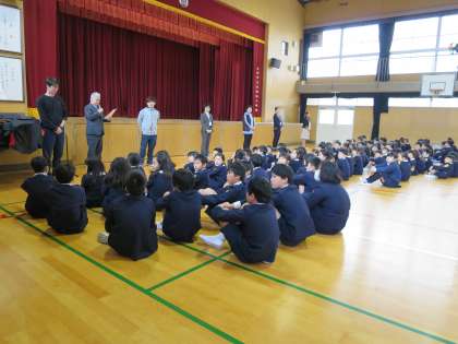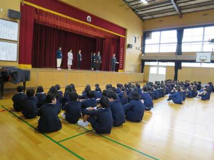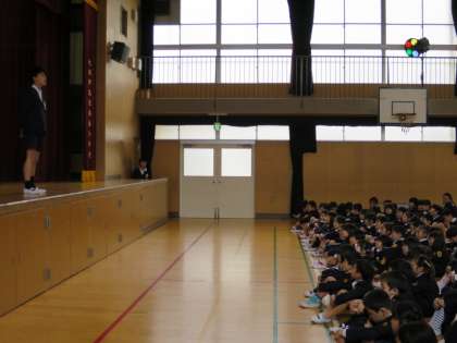 始業式では、校長先生から新転任の先生の紹介や担任の先生の発表などがありました。担任の先生が発表されるたびに歓声があがりました!今日から1年間よろしくお願いします。また、6年生代表児童による新学期に向けた抱負の発表もありました。