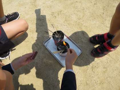理科の時間に「どんな時に、木がよく燃えるのか」を実験で確めました。グループで安全に気を付けながら実験することができました。