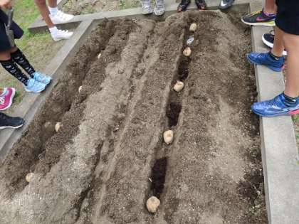 学習園に、じゃがいもの種イモを植えました。どのように成長していくのか、観察しながら育てます。