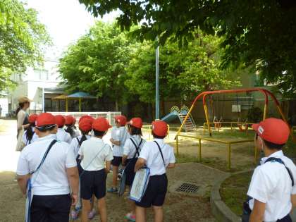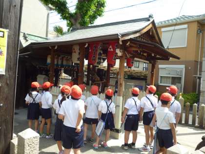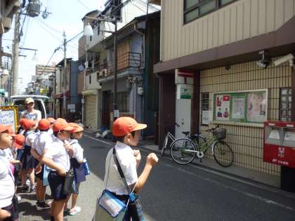 東西南北を校区地図で確認しながら 北鶴橋小学校の校区をぐるり1周しました。神社や憩いの家、郵便局に公園など知っている場所ももう一度みんなで確認しました!
