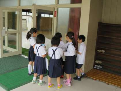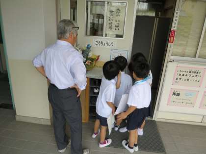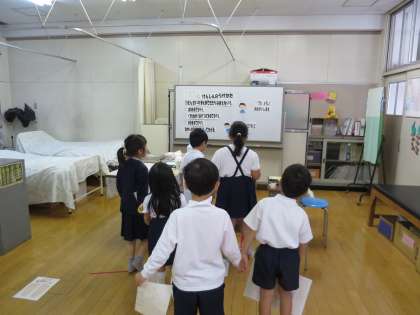 グループになって学校探検をしました。教室をまわってポイントラリーです。各教室では、2年生が何の部屋かを説明をしてくれます。ポイントに貼ってある2年生手作りの説明の絵や文章もよく書けています(*^_^*)