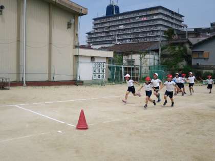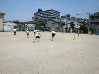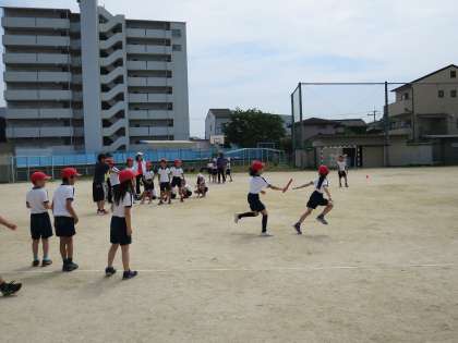 リレーの練習をしました。まずは、チームでバトンパスの練習です。声をかけあいながら何度も練習しているとだんだんタイミングがつかめてきたようです。みんな全力でがんばっていましたね!