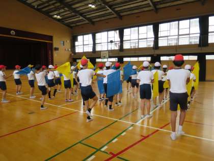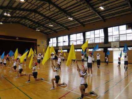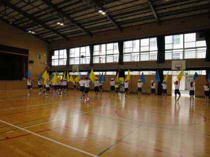 今日から、黄色と空色の旗を持って練習を始めました。たくさんの動きを覚えなければなりませんが、みんなのタイミングがそろうととてもかっこいいです!
