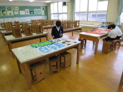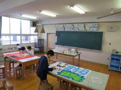 放課後に図工室で応援旗を仕上げています。あと少しで完成しそうです!がんばってね。