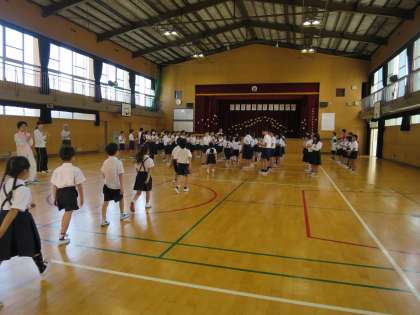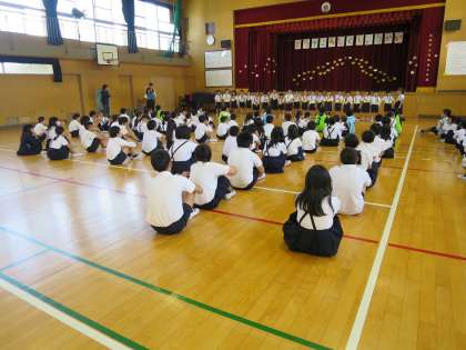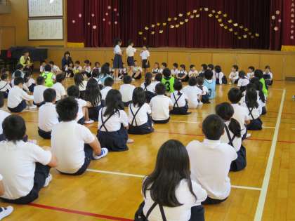 1年生を迎えて、はじめてのたてわり班集会がありました。元気よく入場した後、1年生は、名前や好きな食べ物など一人一人がインタビューに答えました。みんなしっかり答えられていましたね!