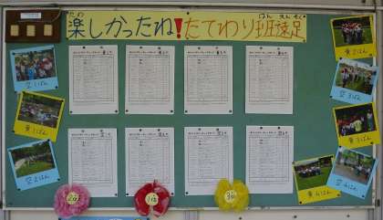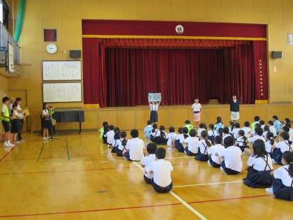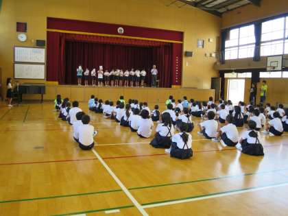 児童朝会でたてわり班遠足の表彰がありました。3位の班から順に発表され、1位の班には、校長先生から表彰状が手渡されました。結果と写真は、職員室前に掲示しています。