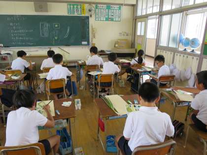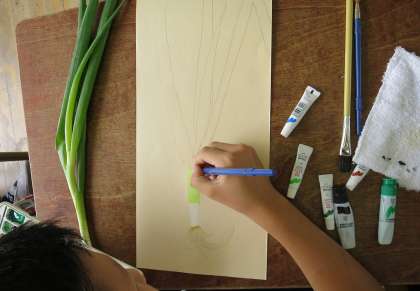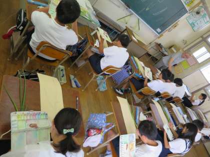 青ねぎを題材にして、写生をしました。配られたねぎをよく見て、ねぎの色に合うように色を混ぜ合わせて作り、少しずつ色を塗っていきました。同じようなねぎに見えますが、一人一人が作りだした色は様々で、仕上がりが楽しみになりました。