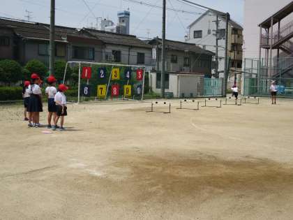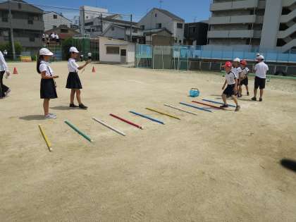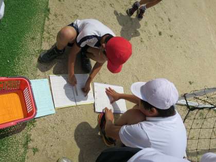カードに毎日の自分の記録を記入しています。高学年がタイムを計測したり、見本を見せて運動の仕方を教えてくれたりしています。