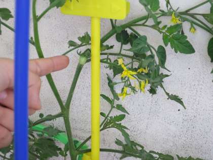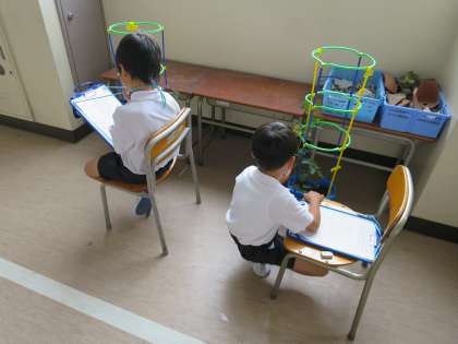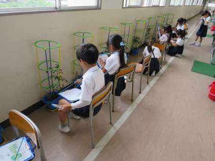 植木鉢で育てているミニトマトがぐんぐん成長してきました。今日は、廊下に運んできて、観察記録を書きました。黄色い花が咲いて、小さな小さなトマトの実もなってきました!